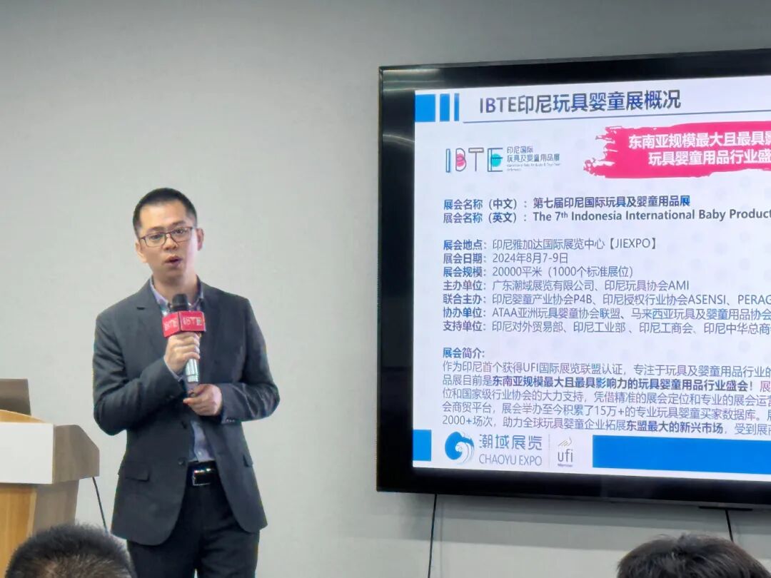 潮域公司副总裁侯怀志作了《开疆拓域-携手IBTE成功打开东盟最大玩具婴童市场》的主题演讲,详细地讲解了IBTE印尼玩具婴童展的概况及2024年IBTE系列海外展会计划。