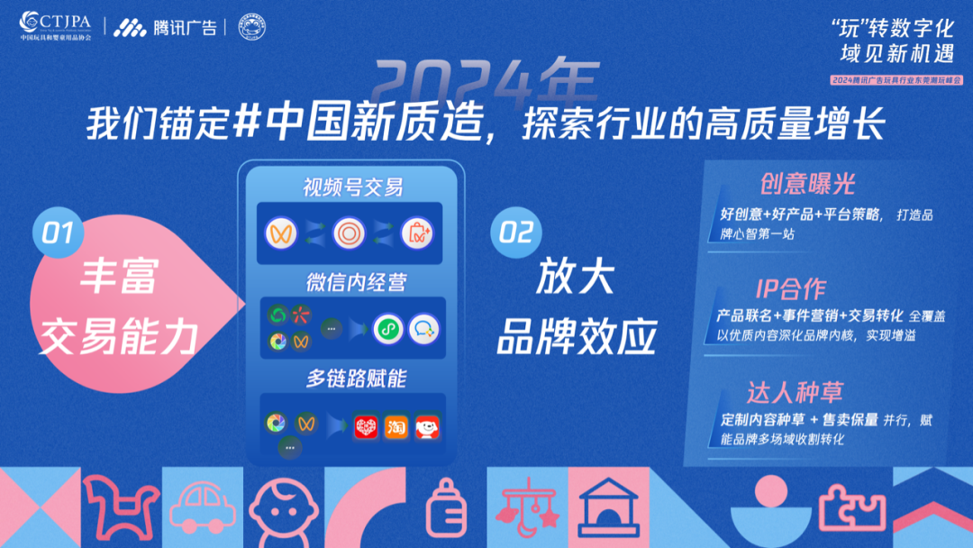 腾讯广告玩具行业运营负责人易思思分享了潮玩品牌在腾讯平台上三种主要的生意模式,分别是视频号交易、微信内经营和多链路赋能。利用腾讯的生态引流合作方式,将流量引入平台电商店铺,实现全链路人群触达,为全域营销加成。
